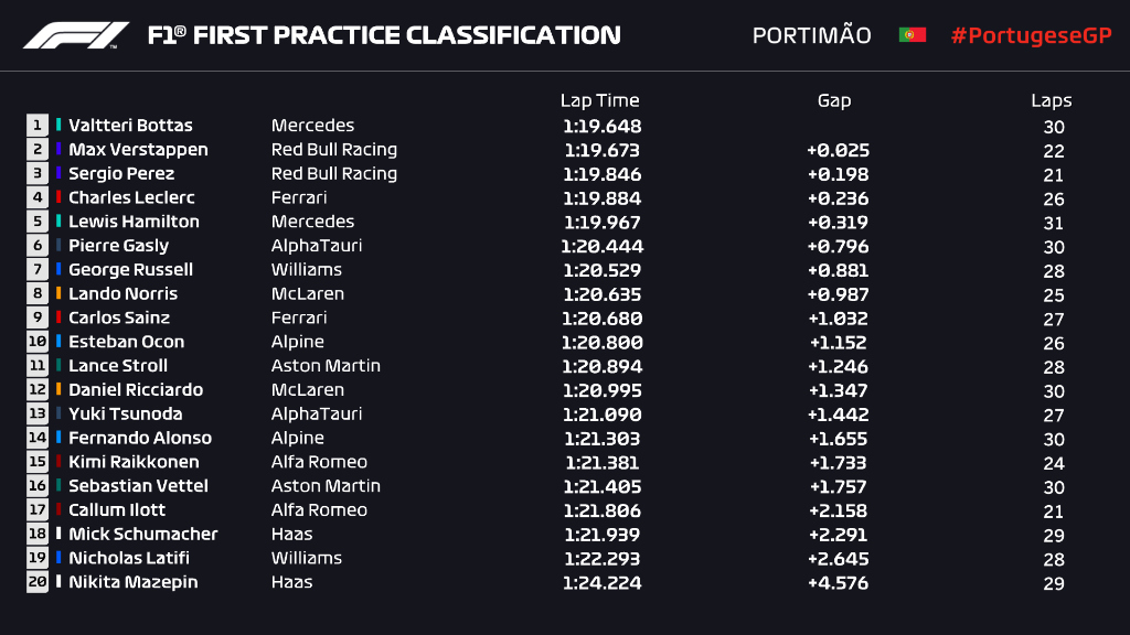 C’est le pilote Mercedes Valtteri Bottas qui a signé le meilleur temps de la première séance d’essais libres du Grand Prix du Portugal en 1,19.648 en pneus Tendres.