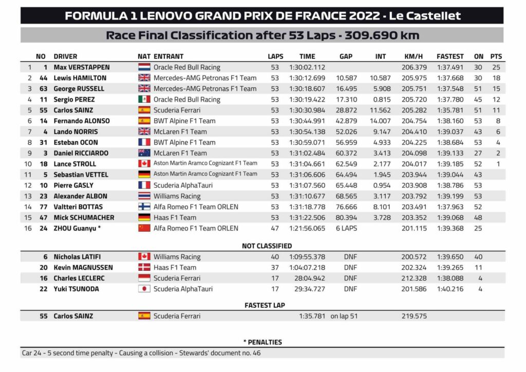Les résultats définitifs du GP F1 de France 2022