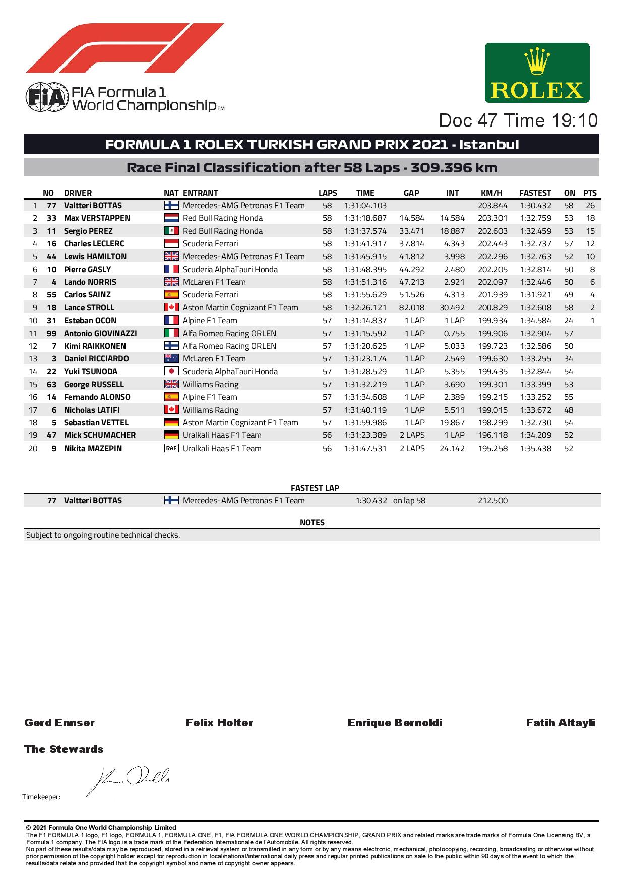 Voici les résultats définitifs du Grand Prix de Turquie 2021, seizième manche du championnat du monde de Formule 1, disputé ce dimanche 10 octobre à Istanbul.