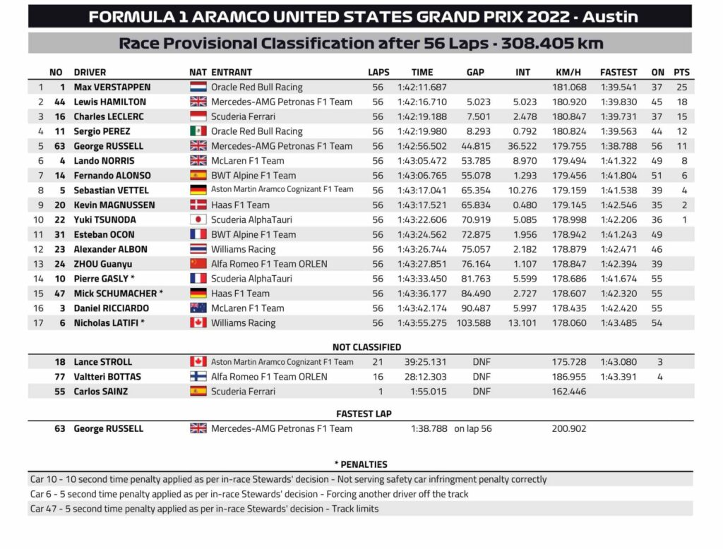 C’est le pilote Red Bull Max Verstappen qui a remporté le Grand Prix des Etats-Unis 2022, le Néerlandais devance sur la ligne d’arrivée la Mercedes de Lewis Hamilton et la Ferrari de Charles Leclerc.