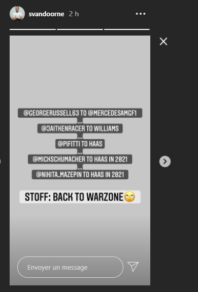 « George Russel chez Mercedes, Jack Aitken chez Williams, Pietro Fittipaldi chez Haas, Mick Schumacher chez Haas en 2021, Nikita Mazepin chez Haas en 2021. Stoff : de retour à Warzone (le jeu vidéo Call of Duty). » a écrit le Belge.