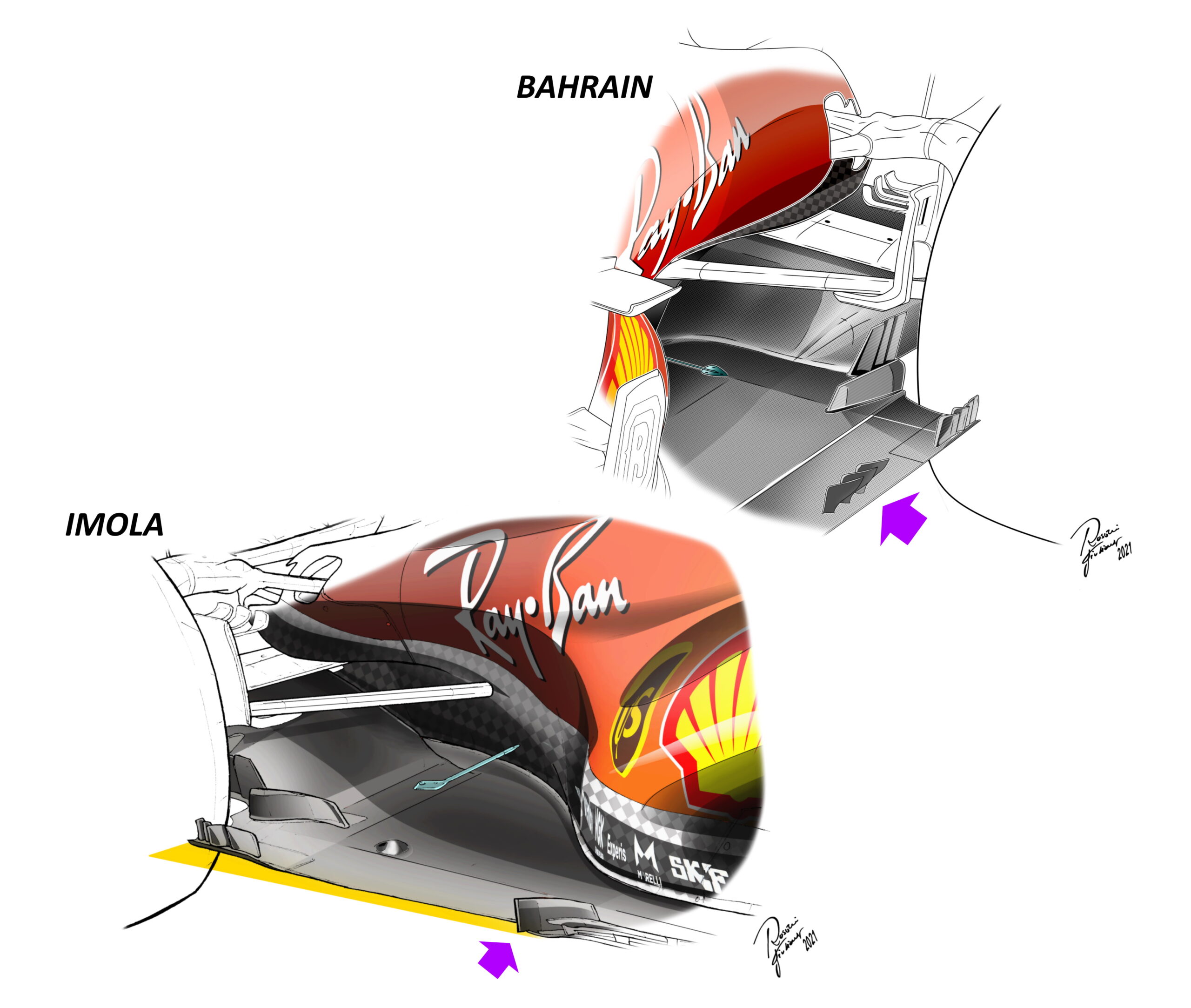 Sur le circuit  Enzo et Dino Ferrari, la monoplace de Leclerc et Sainz était équipée avec des solutions techniques différentes par rapport à la version de Sakhir [première course de la saison], avec le lancement de la version modifiée du fond plat, et l’ajout de divers dispositifs aérodynamiques pour adapter la SF21 à la piste d’Imola.