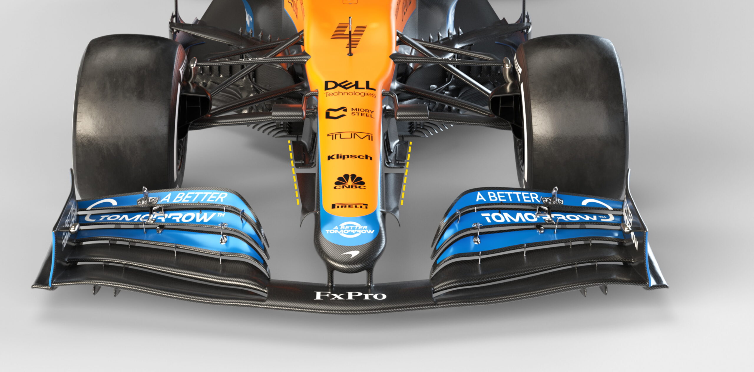 L’inverseur de flux de manteau, appelé «cape» dans le jargon technique, a été légèrement révisé, qui par rapport à la version fin 2020 est plus aligné avec les aubes tournantes sous la structure. Tout en conservant la même structure avant déformable, Mclaren a continué à développer la partie aérodynamique qui l’entoure, pour avoir une plus grande propreté des flux sous la voiture avec la nouvelle cape.