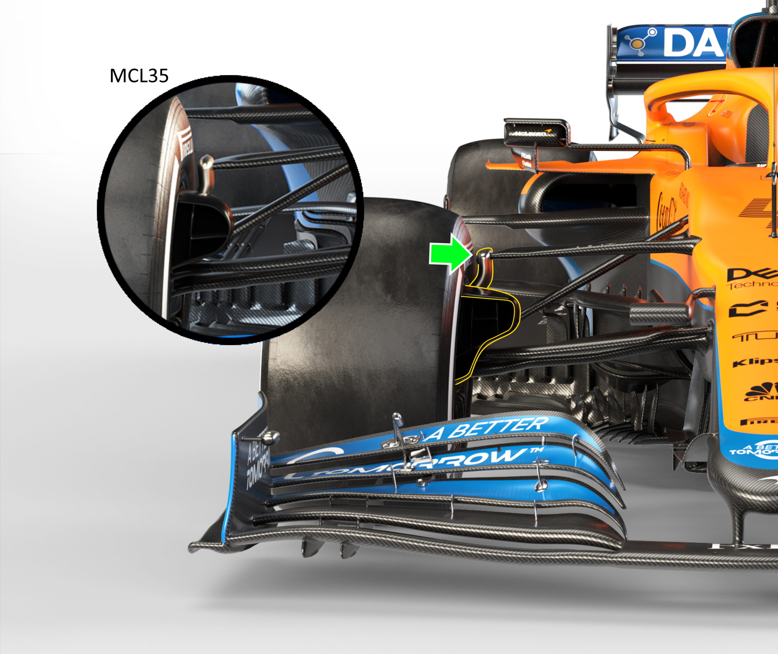 À cet égard, alors qu’elle ne peut pas modifier les pièces internes homologuées de la suspension avant, Mclaren a légèrement modifié la conception du pivot du triangle supérieur (flèche verte) et du support, c’est-à-dire l’élément qui déplace le point d’ancrage de la jambe de suspension vers la tige de poussée.