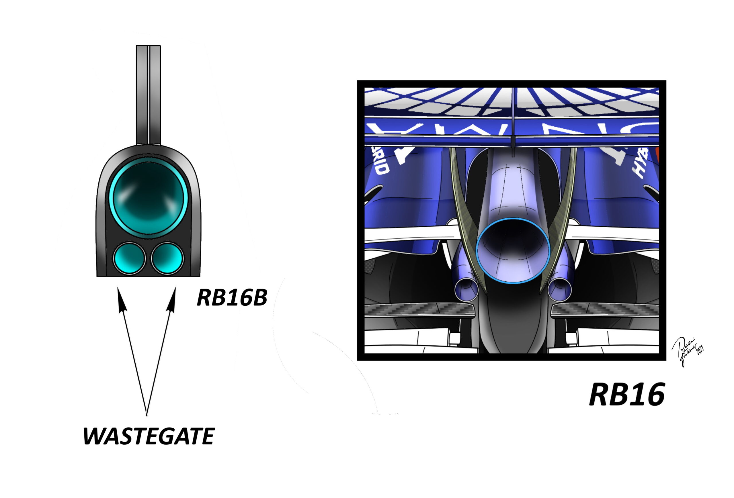 L’une des curiosités en observant les images de la RB16B fournies par Red Bull concerne l’absence (tout du moins visuellement) des échappements de wastegate: la disposition des échappements de wastegate a été modifiée l’année dernière à partir du Grand Prix de Turquie et ont été déplacés sur une position inférieure, juste en dessous du bras triangulaire de suspension.