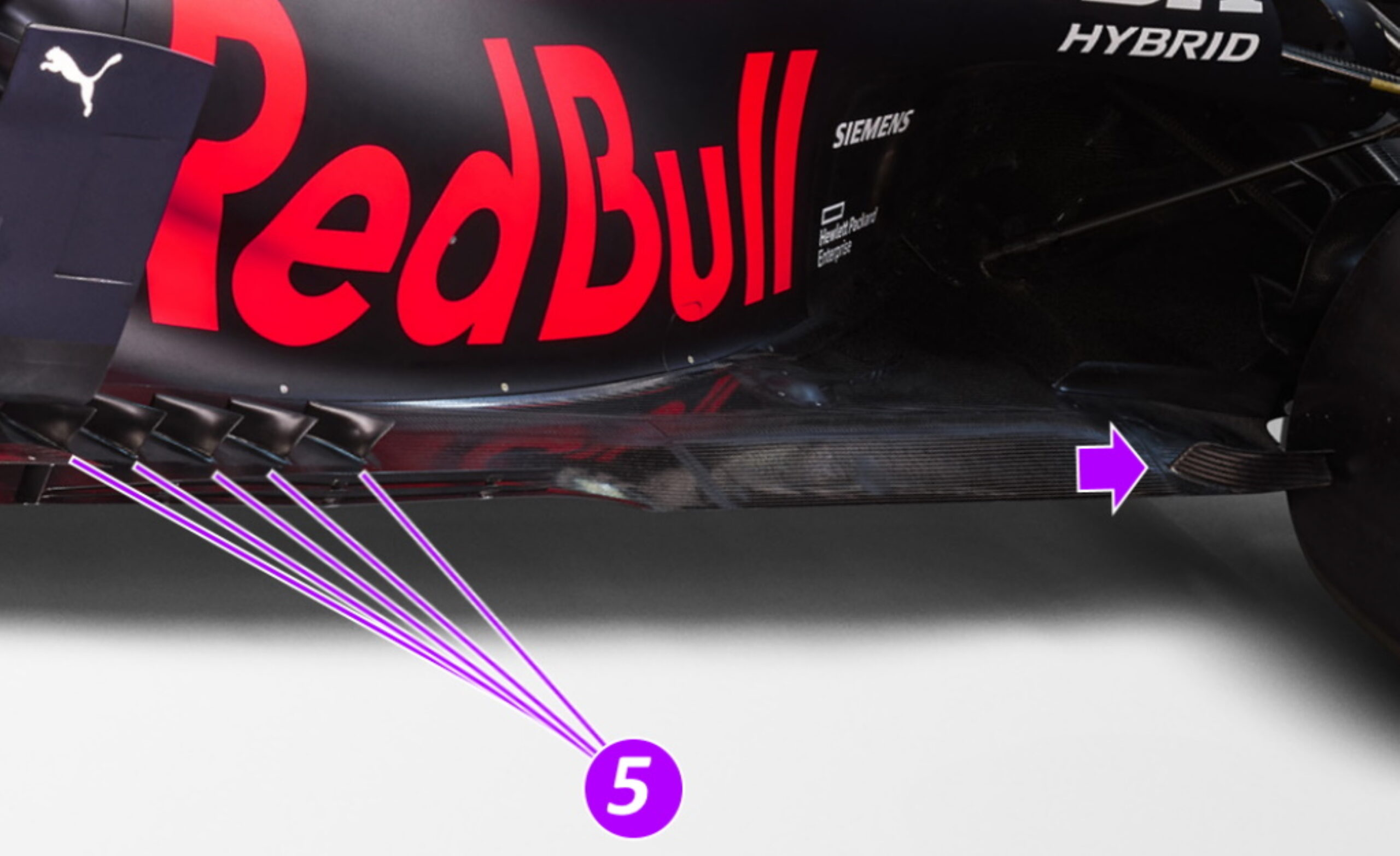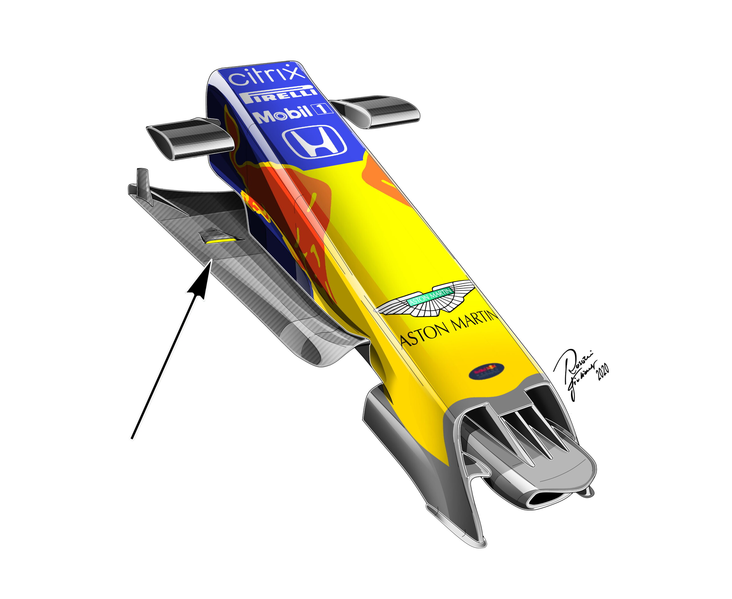 Quant au fond plat, qui par la réglementation rétrécit d’environ 10 cm vers l’arrière, il dispose de cinq générateurs de vortex (sur la RB16 il y en avait 4). Dans la zone située devant la roue arrière, il y a à la place un petit élément vertical, qui agit comme un véritable winglet, pour réduire les turbulences sur les roues arrière. Cette dernière solution est presque identique à celle testée à Abou Dhabi l’an dernier lors des essais libres, lors d’un test de collecte de données en vue de 2021.