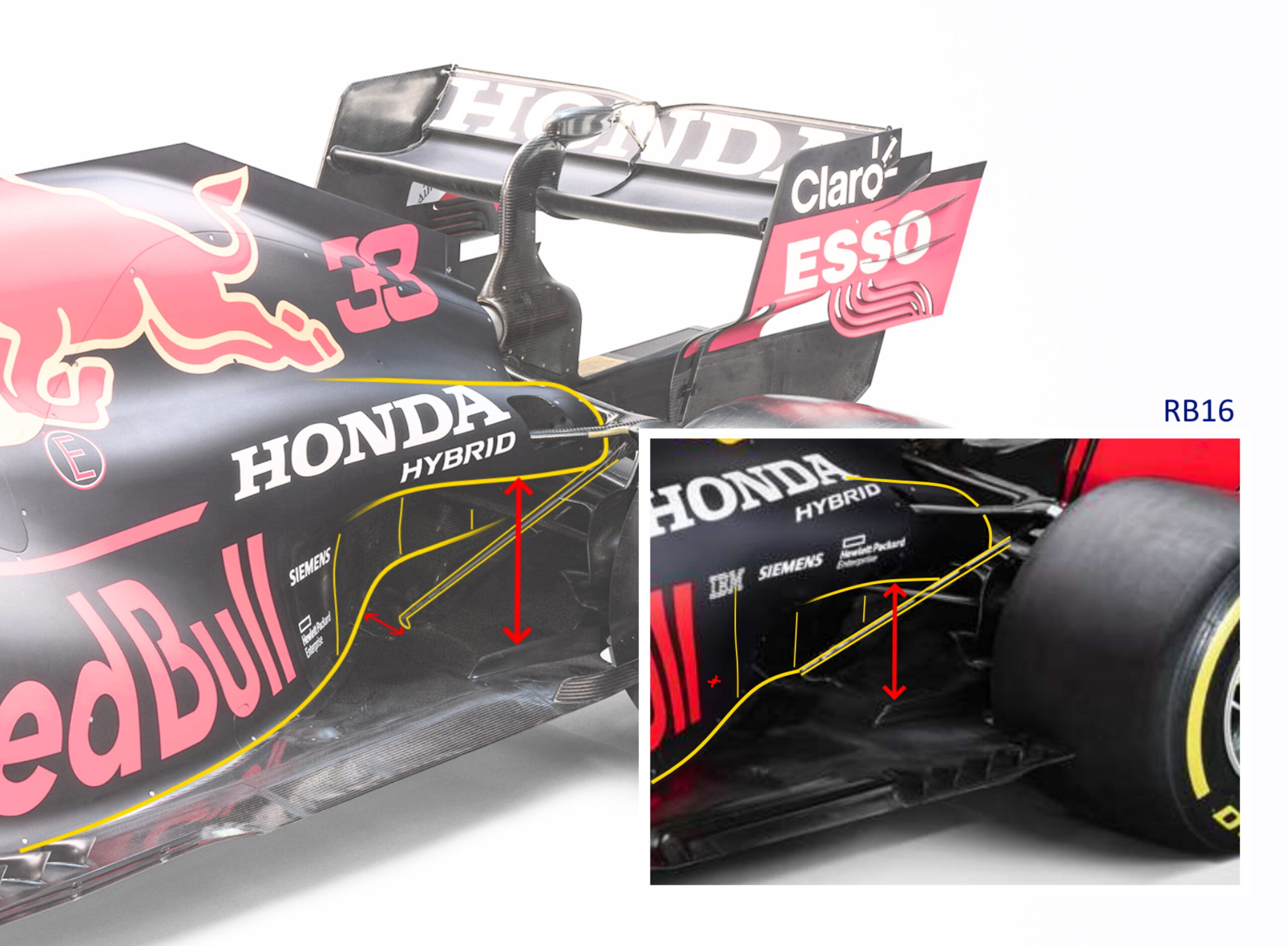 Sur la RB16B, il y a donc une référence et un développement direct des bargeboards de la fin de la saison 2020, sur lesquels on peut voir un travail de raffinement aérodynamique des concepts déjà vus sur la RB16 l’an dernier.