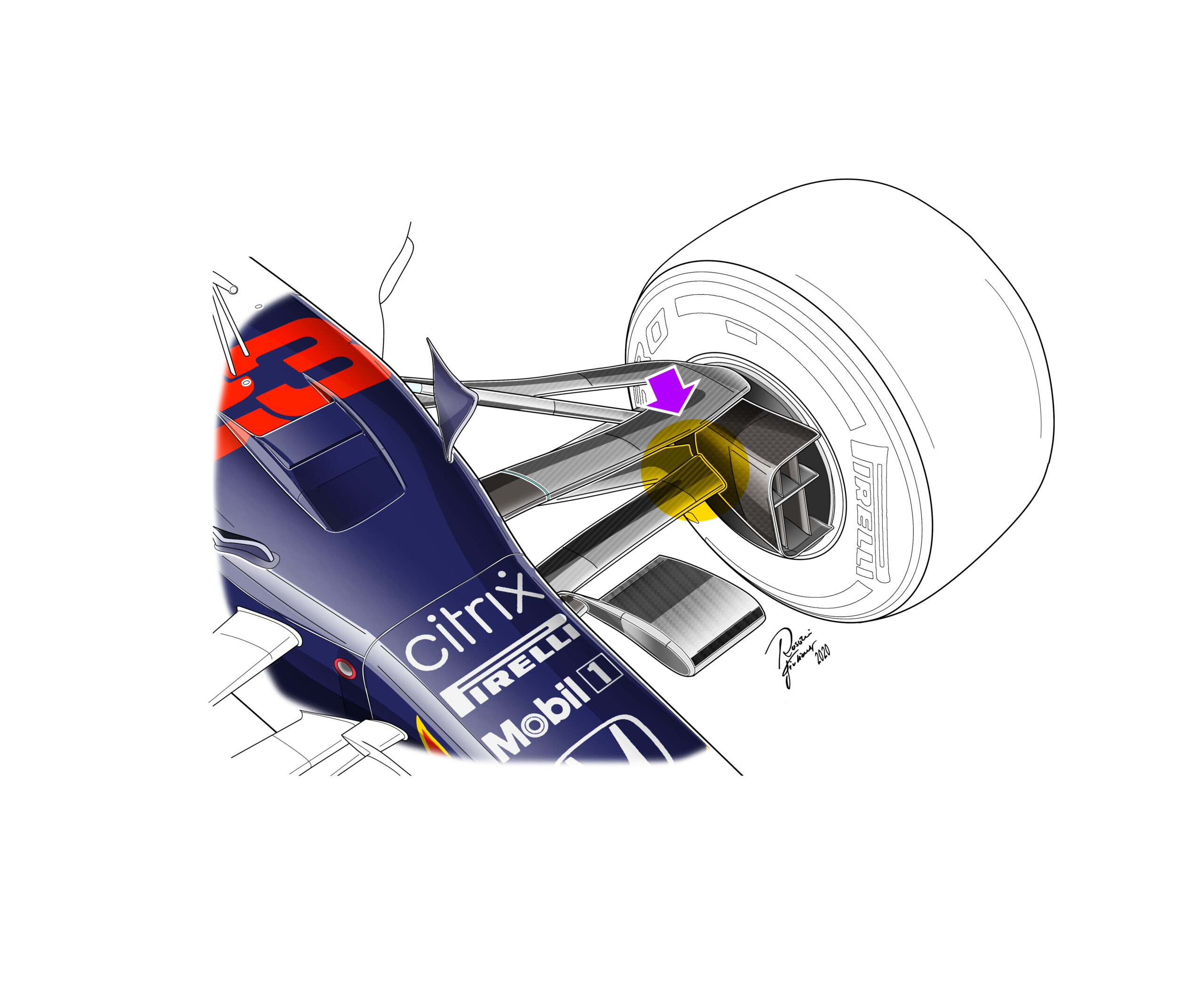 Le but, purement aérodynamique, consiste à créer un petit canal d’air entre le carénage du bras et la partie supérieure de l’extracteur, pour recréer une sorte de double diffuseur. Nous avons vu un choix similaire l’année dernière sur la Mercedes W11, alors qu’Adrian Newey a même tenté d’émuler cette solution dans une disposition plus conventionnelle.