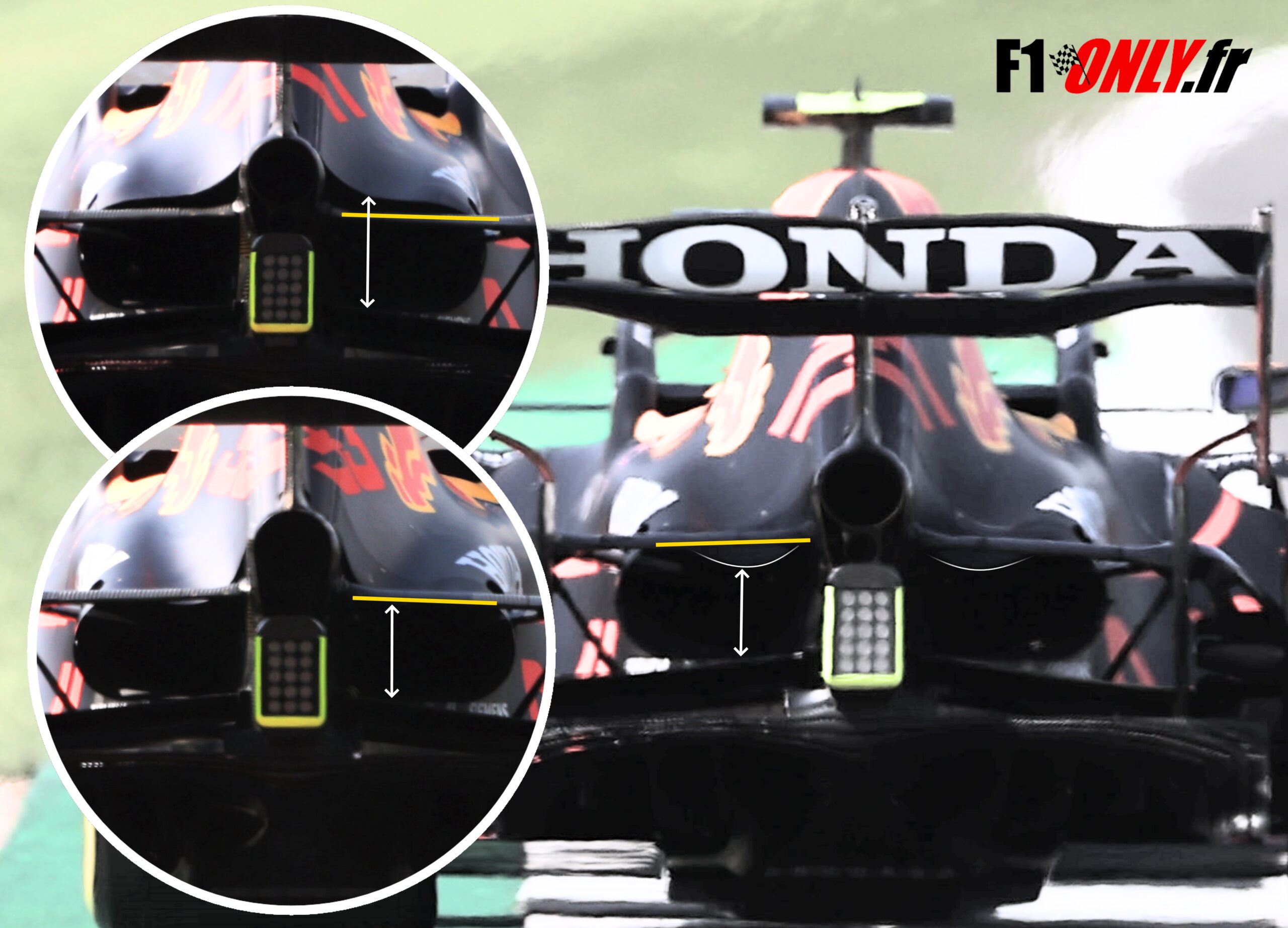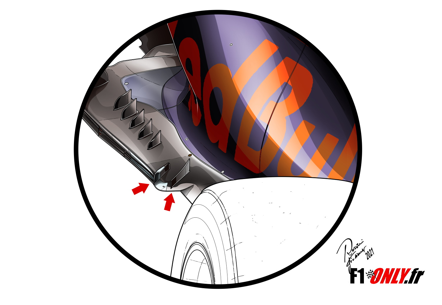 En agissant ainsi, Red Bull a essayé de récupérer l’appui perdu causé par la découpe du fond plat imposée par la réglementation, en essayant de dévier les tourbillons d’abord vers la partie la plus externe, et de les sceller dans la partie inférieure, augmentant ainsi l’efficacité du diffuseur arrière.