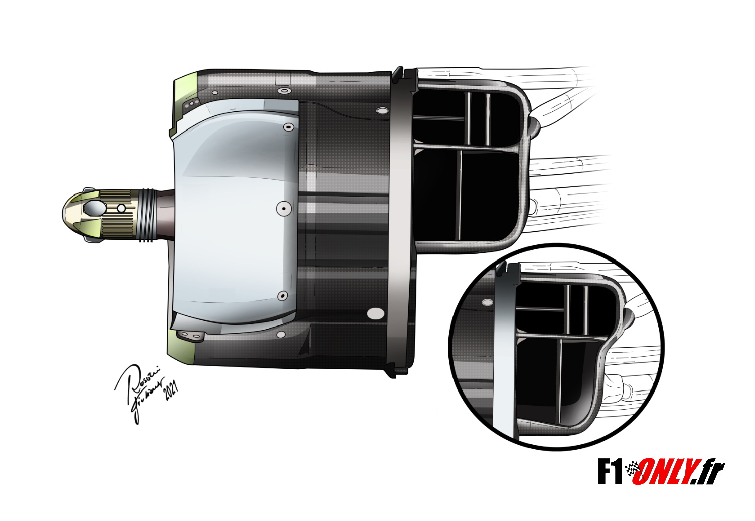 La solution en forme d’oreille qui reprend celle utilisée en 2020, sacrifie légèrement l’efficacité aérodynamique pour une meilleure gestion des températures au cœur de la gomme. On pourrait penser qu’il s’agit d’une solution exclusivement liée au refroidissement des disques de frein, mais en réalité, elle aurait pu être convenablement étudiée pour mieux gérer les températures internes de la gomme, après que Pirelli ait décidé de modifier la structure des pneumatiques au beau milieu du championnat 2021. La décision de faire marche arrière et de revenir à une solution similaire à 2020 n’est donc pas anodine.