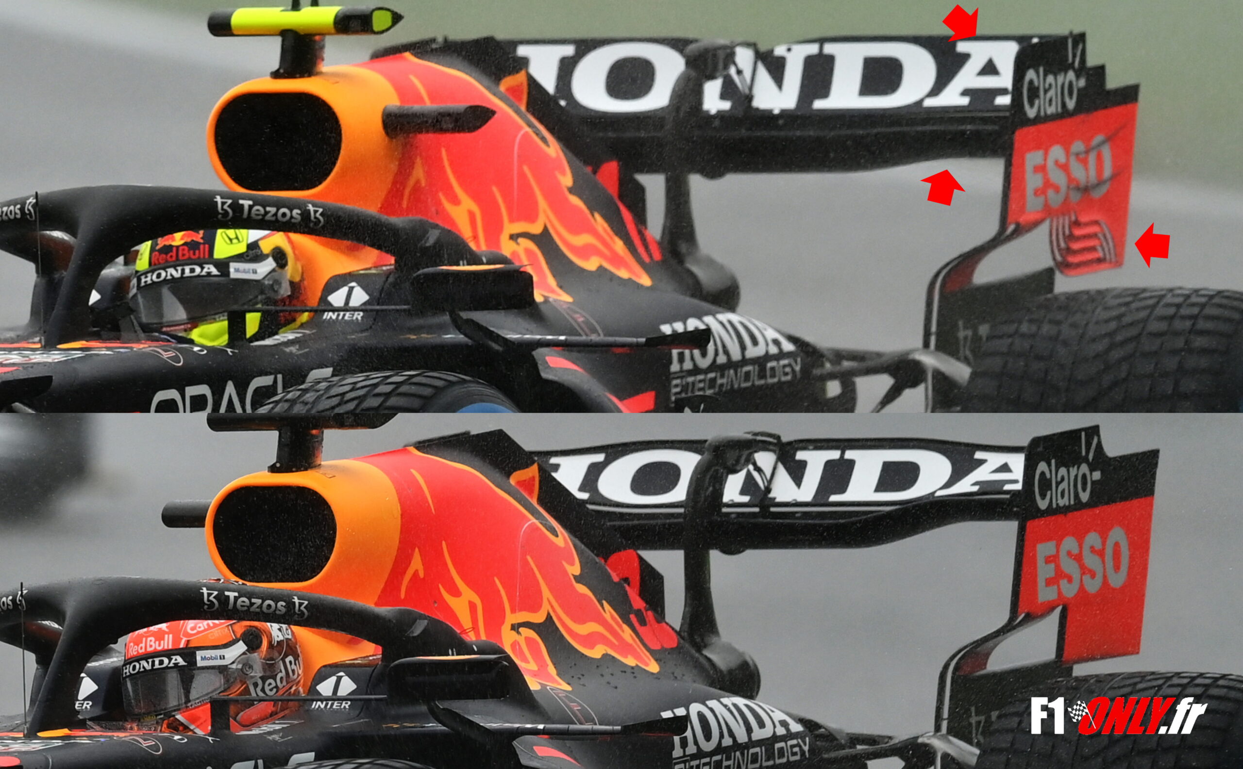 Avec les fortes pluies de dimanche, il était effectivement préférable d’avoir plus d’appuis que dans des conditions sèches, et Red Bull a voulu profiter du départ de Perez depuis la voie des stands pour contourner la règle du parc fermé en montant sur sa monoplace un aileron arrière avec plus d’appuis. Mais cela n’a finalement servi à rien, à cause du drapeau rouge.