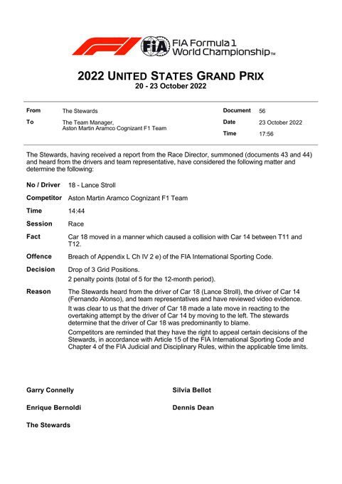 Les commissaires du Grand Prix des Etats-Unis ont considéré qu’un mouvement tardif de la part de Lance Stroll était la cause de l’accident survenu entre lui et Fernando Alonso. Le pilote canadien est donc pénalisé de trois places sur la grille lors du prochain Grand Prix qui aura lieu au Mexique. Il reçoit également deux points de pénalité sur sa SuperLicence.