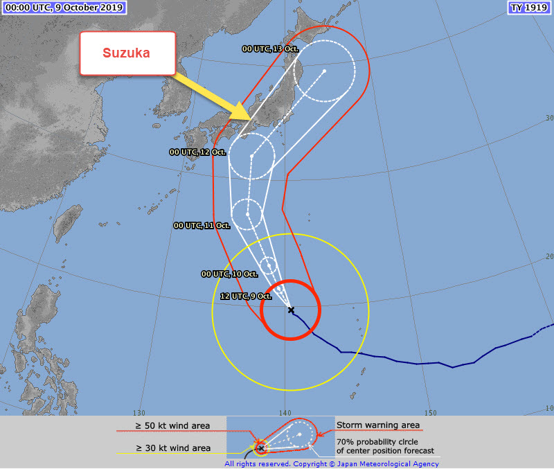 Même si rétrogradé, le Typhon apportera dans son sillage des vents très violents (proche de 80km/h) et surtout de très grandes quantités de précipitations (80 mm de pluie) sont attendues à Suzuka.