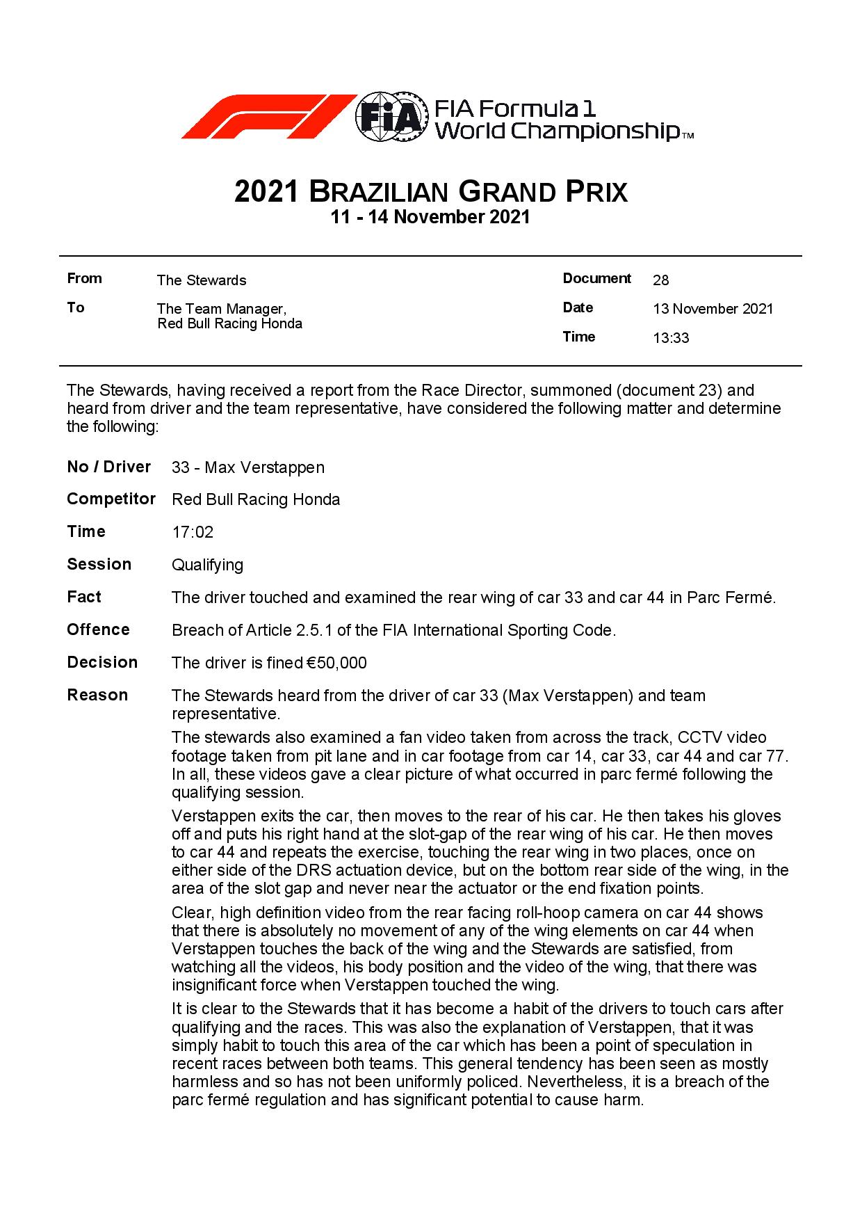 « Il est clair pour les Commissaires Sportifs qu’il est devenu une habitude pour les pilotes de toucher les voitures après qualifications et les courses. C’était aussi l’explication de Verstappen, qu’il avait simplement l’habitude de toucher cette zone de la voiture qui a été un point de spéculation dans les courses récentes entre les deux équipes. Cette tendance générale a été considérée comme principalement inoffensif et n’a donc pas fait l’objet d’une surveillance uniforme. Néanmoins, il s’agit d’une violation de la règlementation du parc fermé et aurait pu causer de potentiels dommages. »