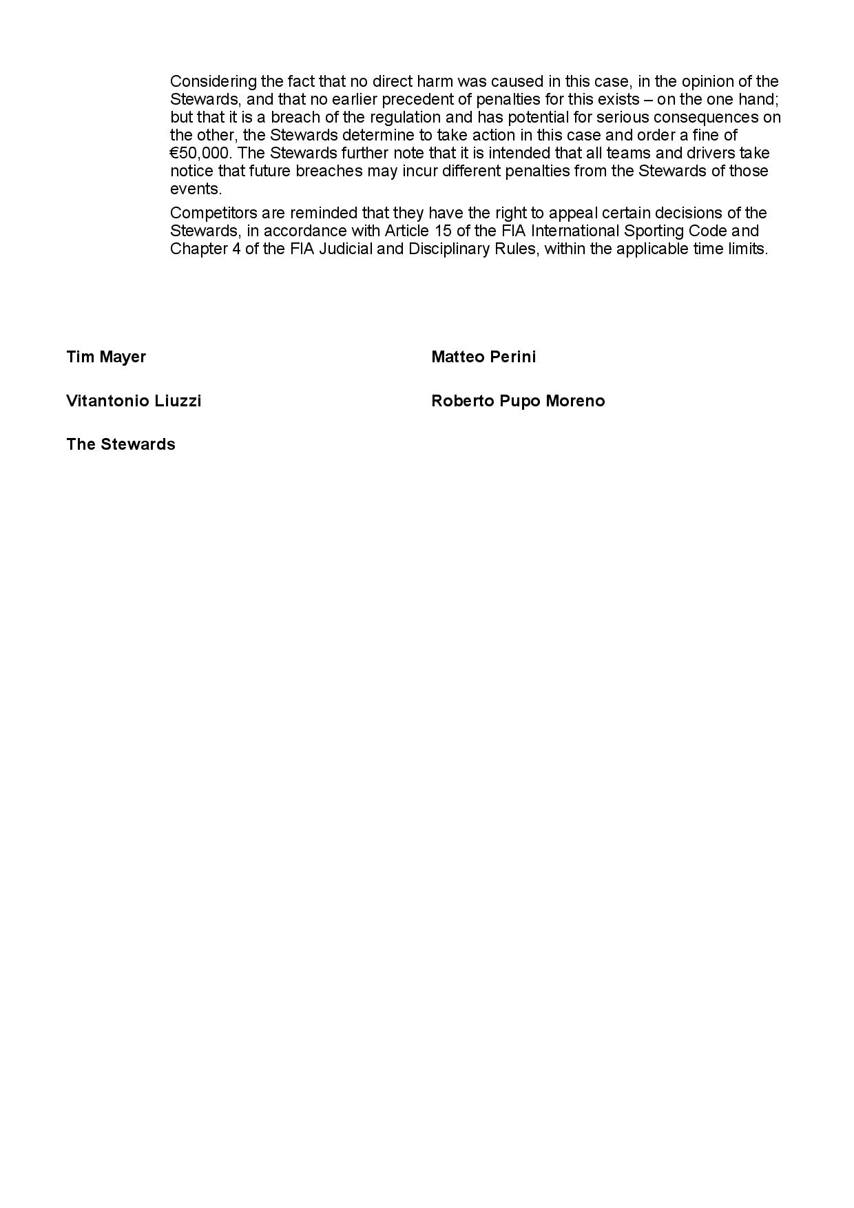 « Considérant qu’aucun préjudice direct n’a été causé en l’espèce, de l’avis des Stewards, et qu’il n’existe aucun précédent de sanctions pour cela – d’une part ; mais qu’il s’agit d’une infraction au règlement et qu’il peut avoir des conséquences graves sur l’autre, les Commissaires Sportifs décident d’agir dans cette affaire et condamnent à une amende de 50 000 €. Les Commissaires Sportifs notent en outre qu’il est prévu que toutes les équipes et tous les pilotes prennent avis que les futurs manquements peuvent entraîner des sanctions différentes de la part des Commissaires Sportifs de ces événements. »
