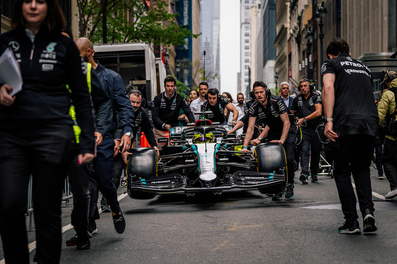 Le pilote Mercedes a pris le volant de la W12 et a été rejoint par une version grandeur nature de la voiture de course emoji récemment lancée sur WhatsApp. Ce run dans les rues de Big Apple a marqué la toute première démonstration en direct d’une voiture de Formule 1 à Manhattan.