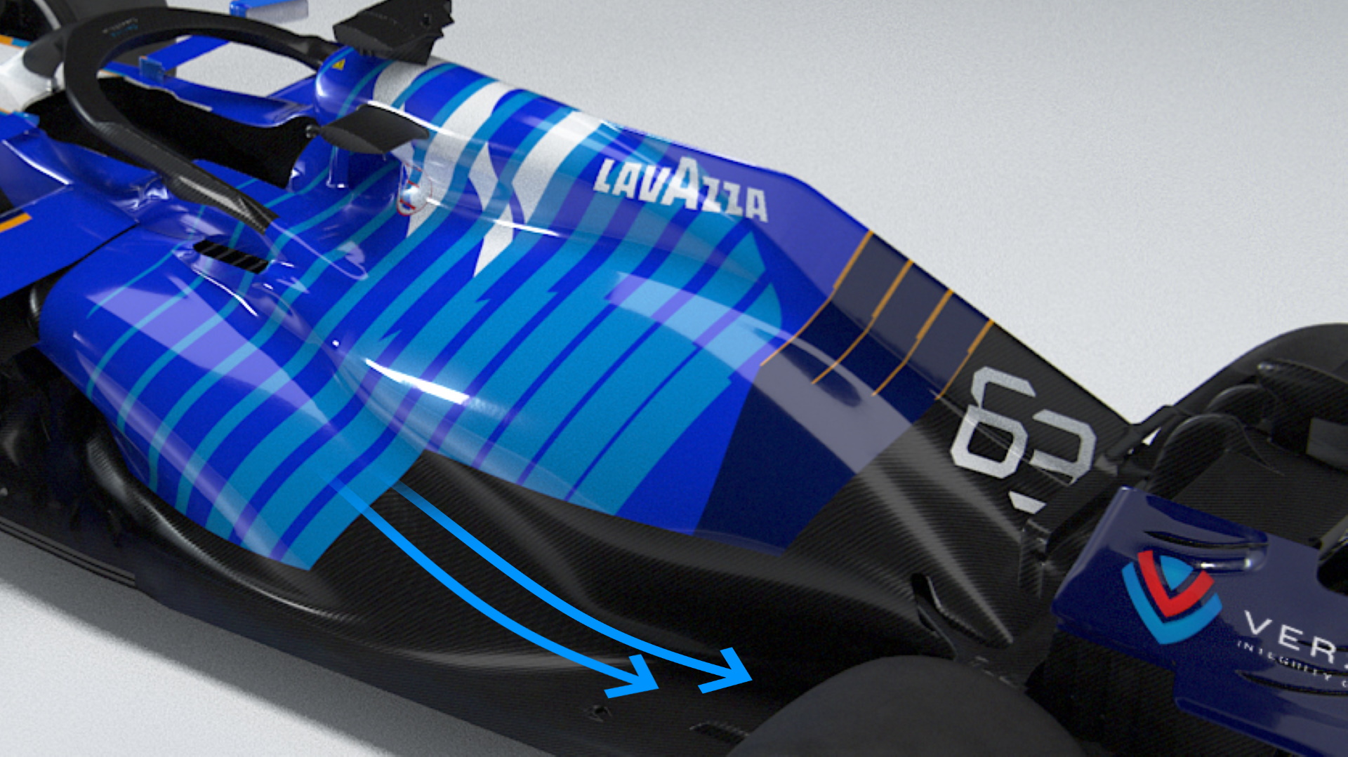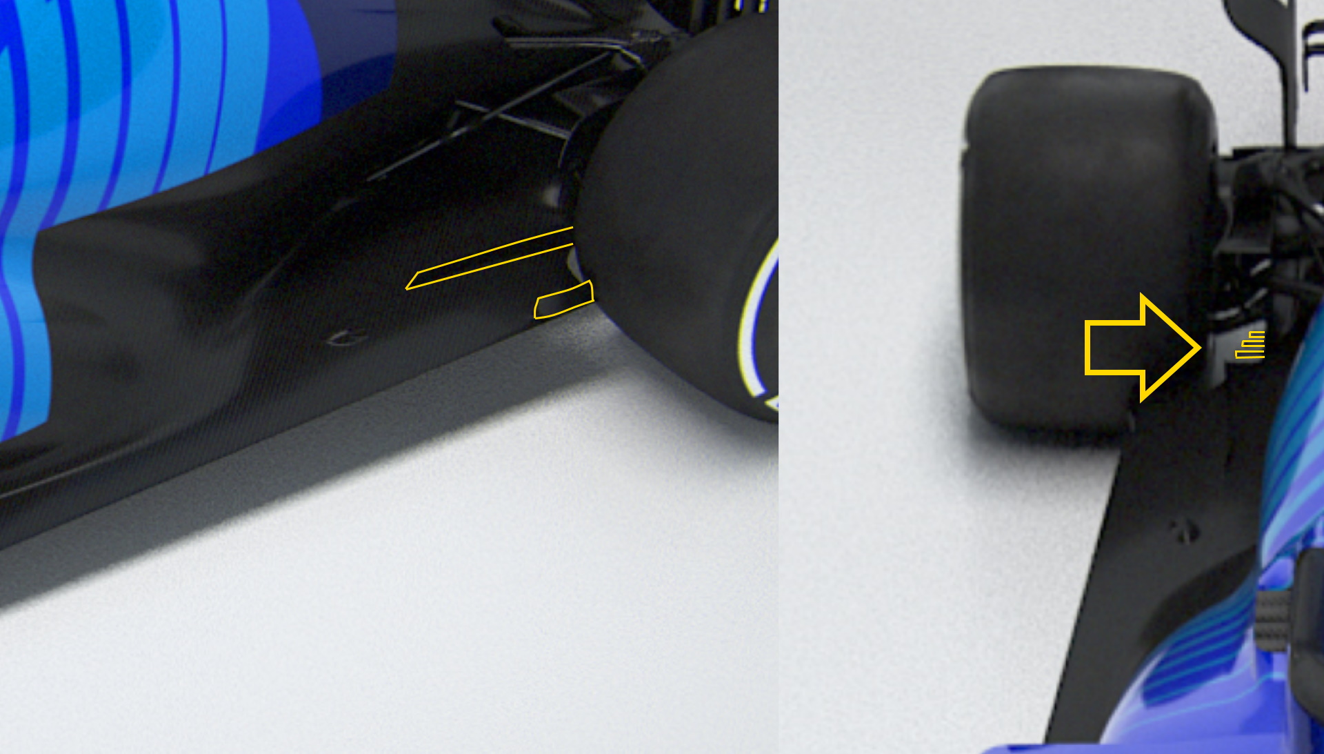 Dans cette zone, par exemple, nous avons pu voir sur l’Aston Martin AMR21 des « bosses » en raison de l’encombrement des composants mécaniques du moteur Mercedes. La Williams quant à elle reste une monoplace très exigeante en terme de refroidissement.