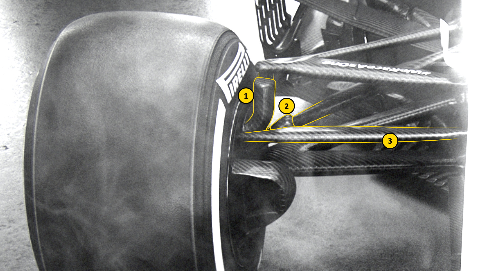 A leur place, une sorte de cloison de style Red Bull a été insérée pour détourner le flux d’air de la roue arrière. Il y a également trois petites ailettes dans la zone extérieure du diffuseur, dans la partie intérieure de la roue arrière.