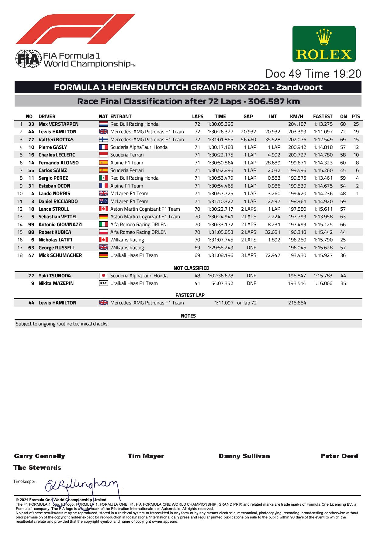 Les résultats définitifs du Grand Prix des Pays-Bas 2021